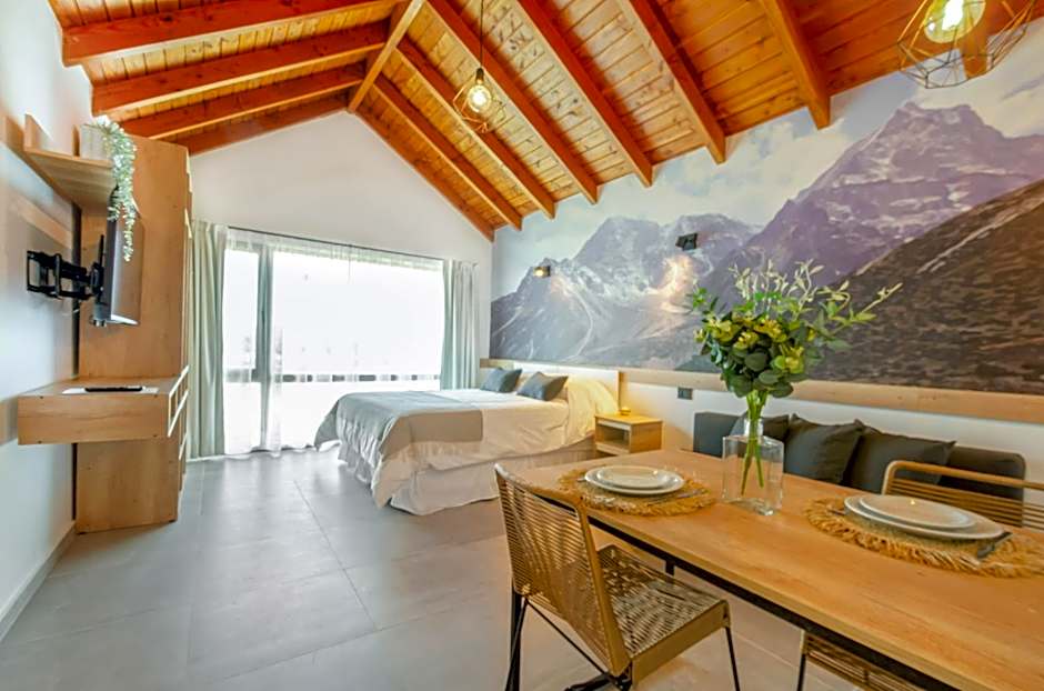 Our studios are designed for the comfort of two people, with a double bed base. They have an integrated kitchen with a breakfast bar, crockery for two and a complete private bathroom. The heating is done by radiant floor. Located on the ground floor with views of the garden. The photos are informative since we have apartments in all the buildings, and their orientation will be subject to availability on the day of your arrival.